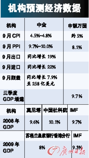 彭博社對(duì)12名經(jīng)濟(jì)學(xué)家進(jìn)行的調(diào)查數(shù)據(jù)平均值顯示,中國(guó)三季度GDP的增長(zhǎng)率同比將增長(zhǎng)9.7%,較上一季度的10.1%有所下滑。中國(guó)的制造業(yè)在今年第3季度受到了較大打擊,出口訂單減少,部分工廠關(guān)閉。8月的工業(yè)生產(chǎn)增長(zhǎng)率為6年來(lái)的最低值。股價(jià)和房地產(chǎn)市場(chǎng)的低迷仍在持續(xù),分析師預(yù)計(jì),中國(guó)三季度經(jīng)濟(jì)增長(zhǎng)率為2004年第4季度以來(lái)的最低水平,而這將成為旨在防止經(jīng)濟(jì)惡化的降低利率政策以及財(cái)政支出的壓力。