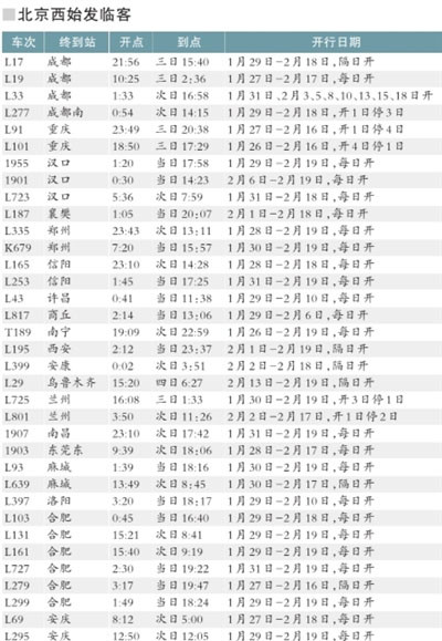 節(jié)后加開的55趟臨客中,北京西站有35趟,北京站有16趟,北京北站有4趟。這些臨客中開往合肥方向的臨客有7趟,哈爾濱方向的臨客有5趟(包括動(dòng)車組D29、Z115、T71)。以上臨客最早的從大年初一開行,最晚的要到2月19日。旅客可參考車站公告了解具體開行情況。
