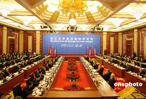 中新網(wǎng)北京12月12日電(記者 王巖 俞嵐 翁陽(yáng)) 第三次中美戰(zhàn)略經(jīng)濟(jì)對(duì)話十二日在北京舉行,中國(guó)國(guó)務(wù)院副總理吳儀和美國(guó)財(cái)長(zhǎng)保爾森主持會(huì)議。