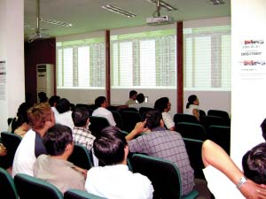 ORS證券公司位于胡志明市第一郡,與胡志明證券交易所一街之隔。隨著越南指數(shù)從2007年3月12日的歷史最高點(diǎn)1170點(diǎn)跌至今年6月的370點(diǎn)低位,幾月以來,這里已經(jīng)成了大多數(shù)股民的“傷心地”。不過,昨天上午9點(diǎn),想在這里找到一個(gè)位子已經(jīng)不太容易。而交易大廳偶爾響起的掌聲更將人們心頭的陰霾一掃而空,“漲了!睅讉(gè)股民對自己的收獲很滿意。