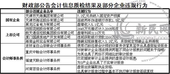 針對檢查發(fā)現(xiàn)的問題,各級財政部門依法進(jìn)行了嚴(yán)肅處理。其中,對瀏陽花炮股份有限公司、海南金邦實業(yè)有限公司等違規(guī)企業(yè)予以罰款、補(bǔ)稅、調(diào)賬等處理處罰,對相關(guān)企業(yè)的法定代表人和財務(wù)負(fù)責(zé)人分別予以罰款、吊銷會計從業(yè)資格證書等處罰,對應(yīng)予追究刑事責(zé)任的責(zé)任人依法移送司法機(jī)關(guān)處理;對天津市天海集團(tuán)有限公司等企業(yè)的違規(guī)問題,依法移送有關(guān)地方政府和主管部門核實處理。共有88家會計師事務(wù)所、232名注冊會計師分別受到省級以上財政部門給予的警告、暫停執(zhí)業(yè)、吊銷執(zhí)業(yè)資格等處理處罰,其中對吉林省白山華審會計師事務(wù)所、河南百信會計師事務(wù)所等事務(wù)所予以撤銷,對重慶中翰會計師事務(wù)所、福建天聯(lián)會計師事務(wù)所等事務(wù)所予以暫停經(jīng)營業(yè)務(wù)的處罰。