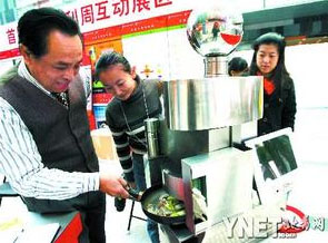 展臺(tái)上,一臺(tái)廚房機(jī)器人特別吸引參觀者的注意,機(jī)器人看上去像是一摞鐵籠屜,背后有各種作料罐,胸前連接著鍵盤和顯示器。機(jī)器人的發(fā)明者向記者演示了一下操作流程,只要放入原材料,點(diǎn)擊電腦中的菜單,機(jī)器人就會(huì)自動(dòng)定時(shí)翻炒,幾分鐘一盤熱菜就出鍋了!澳壳拔乙呀(jīng)開發(fā)了200個(gè)菜單,宮保雞丁、魚香肉絲這樣的家常菜,機(jī)器人都能炒,而且味道還能跟大廚較量!