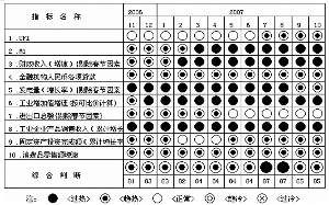 在構(gòu)成綜合警情指數(shù)的10個(gè)指標(biāo)中,變化與9月份基本相同。其中,財(cái)政收入、M1、工業(yè)增加值增速和工業(yè)企業(yè)銷售收入等四個(gè)指標(biāo)繼續(xù)處于紅燈區(qū),并且已經(jīng)持續(xù)了較長時(shí)間;金融機(jī)構(gòu)人民幣貸款增速、固定資產(chǎn)投資增速、消費(fèi)品零售額增速、發(fā)電量增速和CPI五個(gè)指標(biāo)處于黃燈區(qū),其中發(fā)電量增速9月份開始由紅燈區(qū)進(jìn)入黃燈區(qū);在10個(gè)指標(biāo)中,只有進(jìn)出口總額增速處于綠燈區(qū)。