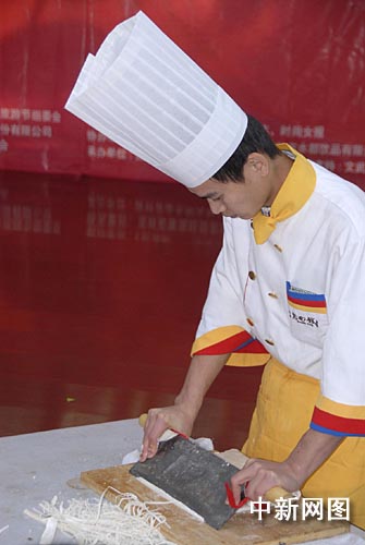 除了較量廚技,長春各酒店的廚師們還帶來了精彩的廚藝絕活表演,鞏玉輝師傅的剪刀面、讓現(xiàn)場觀眾領(lǐng)教了什么是“面板上的舞蹈”,而曹清春師傅的現(xiàn)場食品雕刻,則帶來了一場視覺盛宴。