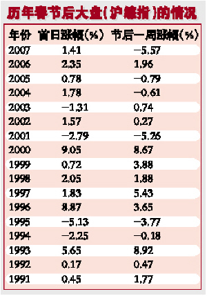 統(tǒng)計(jì)還顯示,從1991年春節(jié)以來的17年中,只有4年春節(jié)后首個(gè)交易日市場沒有“開門紅”,分別是1994年、1995年、2001年、2003年。另外有13年,春節(jié)后首個(gè)交易日大盤均出現(xiàn)不同程度的上漲,占統(tǒng)計(jì)樣本的近80%。(見表)