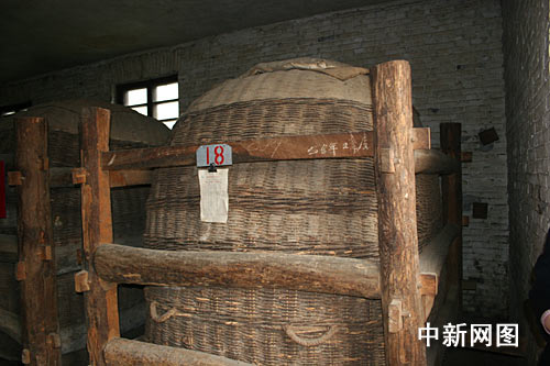 在1956年建造的青磚紅瓦的西鳳酒儲存庫房內(nèi),放著兩排大酒海,大酒海是用一種產(chǎn)自秦嶺深處多年生的特殊藤條編制外殼,然后先用豆腐等原料從里面填糊藤條的縫隙,等干燥后,先后在里面裱糊20層白棉布,等再次干燥后,再在其表面涂上蜂蠟和菜籽油養(yǎng)護一段時間才可投入使用。庫房內(nèi)存儲著各個時期封存的西鳳酒,從1957年到20世紀80年代,網(wǎng)絡媒體記者多是80后,紛紛找與自己“同齡”的大酒海合影。