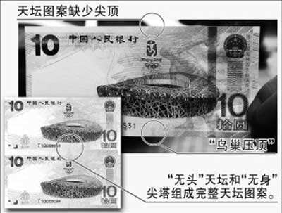 此次發(fā)行的奧運(yùn)紀(jì)念鈔正面主景圖案為北京2008年奧林匹克運(yùn)動會主會場——國家體育場建筑圖案,其上方為第29屆奧林匹克運(yùn)動會會徽圖案,背景輔以世界文化遺產(chǎn)——天壇剪影輪廓示意圖。但一些收藏者發(fā)現(xiàn),天壇的壇頂出現(xiàn)在“鳥巢”圖案的下方。