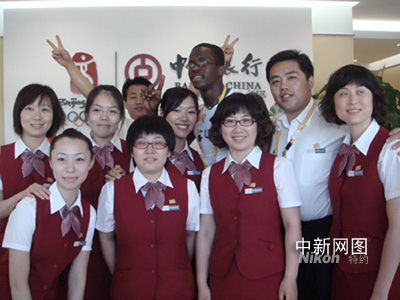 中國銀行運動員村支行員工與即將回國的110米欄奧運冠軍羅伯斯合影留念