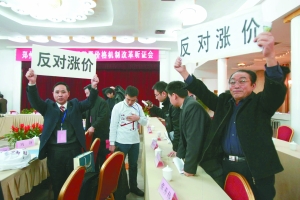正當(dāng)大家以為他要說出意見時,李祥突然站起來,手舉用泡沫板做成的牌子,牌子上貼著四個黑體字:反對漲價。該舉動在與會人員中引起了短暫的騷動。隨后他舉著牌子,對著會場不同方位的觀眾席來回展示,這時,坐在他身后不遠(yuǎn)處的一名旁聽代表,也舉著類似的牌子,配合著李祥。