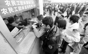 晨報(bào)訊(記者 張碩)昨天,北京站、北京西站開(kāi)始銷售農(nóng)民工火車票,并且接受農(nóng)民工團(tuán)體票的預(yù)訂。這次還開(kāi)設(shè)了農(nóng)民工返程團(tuán)體票的預(yù)訂和發(fā)售,大大方便了在京農(nóng)民工。據(jù)悉,1月6日至15日為民工流高峰。