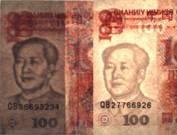 第一種偽造安全線是在鈔票正面,使用灰黑色油墨印刷一個深色線條,背面是用灰色油墨印刷開窗部分,無全息圖文,或含有極模糊的 “¥100”字樣,此類偽造安全線無磁性特征(見下圖)。