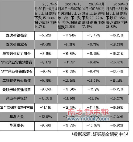 3月份以來,受到股市拖累的股票型基金,凈值下跌最少的也有10%,最多損失超過24%.然而同樣是凈值縮水,今年以來績優(yōu)與績差基金之間的差距居然高達(dá)30%,尋找抗跌的基金已經(jīng)成為今年基金投資的一個主要命題。好買基金研究中心樂嘉慶指出,從去年5月底至今,股市共經(jīng)歷了4個跌幅超過15%的階段。在4個階段中比較抗跌的基金表現(xiàn)出兩大特點(diǎn),一是行業(yè)投資比較均衡的基金,另一個則是規(guī)模適中,倉位調(diào)整迅速的基金。