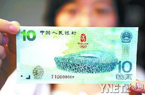 資料圖:面值十元的奧運(yùn)紀(jì)念鈔。圖片來源:北京青年報(bào)