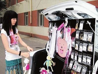 在張?jiān)臄偽粌蛇,沿街停著一溜私家車。捷達(dá)、塞納、帕薩特,甚至還有顏色鮮艷的現(xiàn)代跑車和寶馬MINI。每輛車旁都擺著自家的攤位,服裝、鞋帽、飾品、化妝品、文具等等琳瑯滿目。