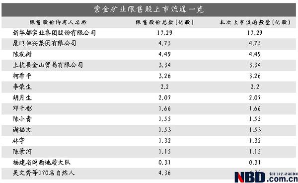 此外,廈門恒興實業(yè)有限公司和上杭縣金山貿(mào)易有限公司分別持有4.75億股和3.34億股。陳發(fā)樹、柯希平、李榮生、胡月生、鄧干彬、陳小青、謝福文、林宇以及陳景河9位自然人解禁股數(shù)也超過了1億股,其中陳發(fā)樹解禁數(shù)量最多,達到4.49億股。這些自然人股東的賬面收益最多的高達44億元,最少的也有11.27億元。