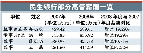 民生銀行的高管薪酬一直在銀行業(yè)中令人艷羨。2008年,民生銀行高管薪酬較2007年整體下降15%,其中,董事長董文標(biāo)領(lǐng)薪1136.6萬元,比上年減少612.02萬元,下降35%;執(zhí)行董事、行長王浵世下降10%至904.15萬元,副行長邵平、梁玉堂等薪酬均下降至589.61萬元,其他高管也分別下降10%~15%。