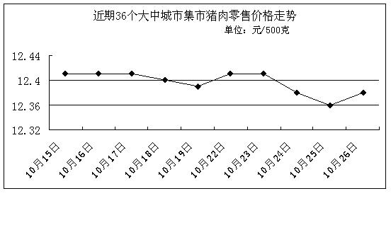 中新網10月29日電 國家發(fā)改委網站消息稱,據國家發(fā)展改革委價格監(jiān)測中心監(jiān)測,上周(10.22-10.26,下同)全國36個大中城市豬肉(精瘦肉)集市平均零售價格每500克為12.39元,比上期(10.15-10.19,下同)下降0.08%。其中,12個城市豬肉價格小幅下降,其它城市豬肉價格與上期基本持平或略有上漲。