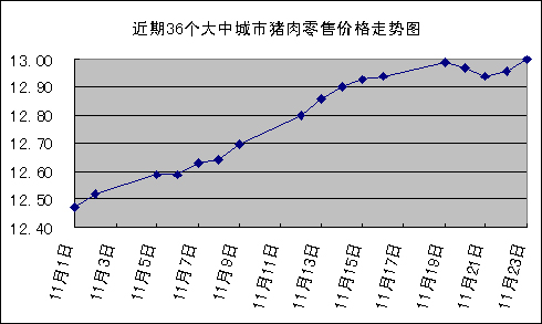 中新網(wǎng)11月26日電 國家發(fā)改委網(wǎng)站消息稱,據(jù)國家發(fā)展改革委價格監(jiān)測中心監(jiān)測,上周(11.19-11.23,下同)全國36個大中城市豬肉(精瘦肉)集市平均零售價格每500克為12.97元,比上期(11.12-11.16,下同)上漲0.62%,漲幅比上期縮小1.44個百分點。