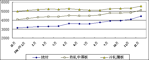 鋼材價(jià)格漲幅較大。12月份,線材(普線6.5,Q235)、熱軋中厚板(6,Q235)、冷軋薄板(1,Q235)全國平均價(jià)格分別為4459元/噸、5097元/噸、5560元/噸,與上月相比分別上漲9.24%、5.64%、4.39%。
