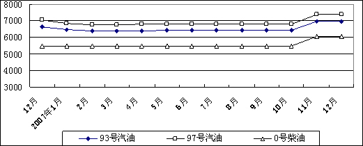 12月份,成品油供應(yīng)緊張局面有所緩解,市場價(jià)格保持基本平穩(wěn)。36個(gè)大中城市加油站90號、93號、97號汽油和0號柴油實(shí)際零售價(jià)格分別為每噸6569元、6985元、7384和6039元,均與上月基本持平。