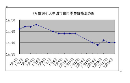 中新網(wǎng)7月21日電 國家發(fā)改委網(wǎng)站稱,據(jù)國家發(fā)展改革委價(jià)格監(jiān)測中心監(jiān)測,上周(7月14日~7月18日)全國36個(gè)大中城市集市、超市豬肉(精瘦肉)平均零售價(jià)格每500克為14.40元,比前一周(7月7日~7月11日,下同)下降0.28%。