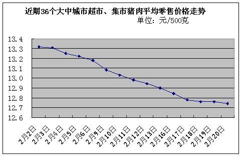 中新網(wǎng)2月23日電 據(jù)國(guó)家發(fā)展改革委價(jià)格監(jiān)測(cè)中心監(jiān)測(cè),上周(2009年2月16日~2009年2月20日,下同)全國(guó)36個(gè)大中城市集市、超市豬肉(精瘦肉)平均零售價(jià)格每500克為12.78元,與前一周(2009年2月9日~2009年2月13日,下同)相比下降1.62%。