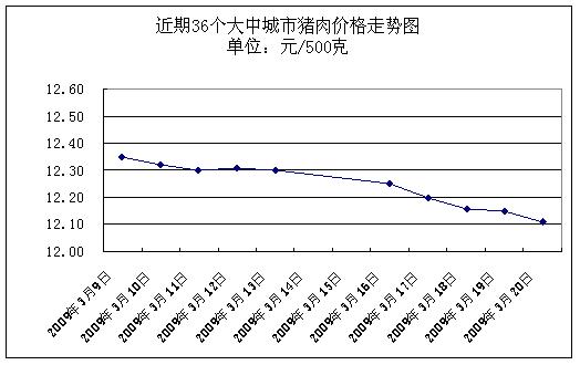 中新網(wǎng)3月23日電 據(jù)國(guó)家發(fā)展改革委價(jià)格監(jiān)測(cè)中心監(jiān)測(cè),本周(2009.3.16-2009.3.20,下同)36個(gè)大中城市集市、超市豬肉(精瘦肉)平均零售價(jià)格每500克為12.17元,與前一周(2009.3.9-2009.3.13,下同)相比下降1.22%。