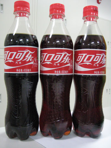 記者接到投訴后迅速趕到現場求證,剛開始時記者還認為楊先生是買到了“山寨版”可樂,并重新買了幾只不同的可樂進行比較。通過觀察發(fā)現問題可樂與記者購買的可樂在外觀上看,每瓶可樂的包裝標簽有細微的差異,這些可樂是奧運城市紀念版的,上面每個展示的城市有所不同?蓸返纳a日期為2008年7月22日,批號為1533BJ06,生產商為北京可口可樂飲料有限公司。再仔細觀察,發(fā)現楊先生購買的可樂的顏色泛紅,透光,顏色明顯比記者購買到的可樂有差異。擰開一瓶可樂聞聞,是有一股濃濃的香味和一股膠味。