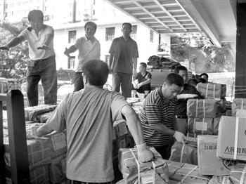 工作人員正在向?yàn)?zāi)區(qū)發(fā)運(yùn)教材。 本報(bào)記者 王立強(qiáng) 攝