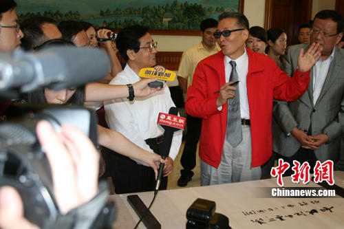 李敖寫罷擱筆。在一旁的趙洪祝出人意料拿起筆,在李敖題字“如此江山真可羨”的“真”字上補(bǔ)了一筆,原來剛才李敖題字筆墨不勻,真字上沒有出頭。