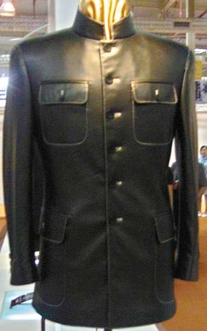 昨天下午,記者現(xiàn)場看到,該展區(qū)的中山裝除了傳統(tǒng)的老款式外,還包括了很多新穎的款式,例如,用香云紗、皮料制作的中山裝,用意大利進(jìn)口面料制作的中山裝……