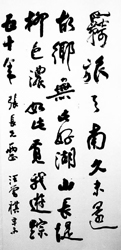 那天,他乘酒興一口氣給我留下兩幅字。其中一幅是這么寫的:“羈旅天南久未還,故鄉(xiāng)無此好湖山;長堤柳色濃如此,覓我游蹤五十年!鳖H具唐風(fēng)的七言絕句,流露出他對(duì)昆明那種強(qiáng)烈而纏綿的感情。