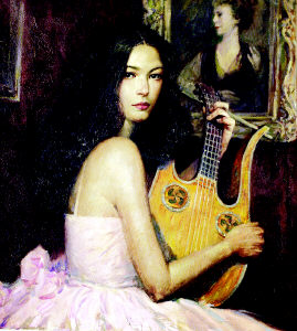 當(dāng)華人社區(qū)對(duì)這位“英雄”贊不絕口時(shí),徐純中也成了最受好萊塢明星歡迎的畫家。畫冊(cè)中一幅《甜蜜的琴聲》正是當(dāng)紅女星凱瑟琳.澤塔.瓊斯的肖像畫。據(jù)徐純中回憶,澤塔.瓊斯當(dāng)時(shí)特地從好萊塢借了一把十分名貴的古琴,還選了一件粉色衣服,來突出自己象牙白的膚色。不過,性格活潑的澤塔.瓊斯每次坐不到十分鐘,就要起身吃東西、接電話,或者吩咐仆人做什么事。徐純中笑說,“過了3個(gè)半小時(shí),我還沒有畫完,澤塔.瓊斯有些不耐煩了。于是,我只能帶著未完成的初稿回去上色。作品完成后,她對(duì)我的作品非常滿意,并與我相約每隔兩年,為她畫一次肖像,現(xiàn)在我已經(jīng)著手第三幅了!