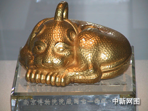記者隔著玻璃窗看到,一只脖套項圈的金豹身覆鱗片,半蹲于座,鱗片在燈光映照下閃爍,光彩灼人,整座展品有著強烈的立體感!斑@叫金獸,古時作保財鎮(zhèn)庫之用,迄今為止仍是中國出土文物中最大最重的金器”,南京市博物院院長龔良如是說。