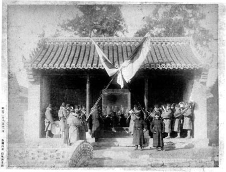 日軍占領威海衛(wèi)文廟(前城里中學)充做司令部,在門前敲鼓吹號。