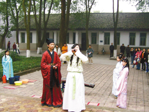 迎賓、洗爵、行拜禮……昨下午,在西南大學(xué)蜀園的孔子像前,20多個學(xué)生進(jìn)行了“鄉(xiāng)飲酒禮”儀式。他們分別扮成主人和賓客,“賓客”將酒杯舉在腰間,向“主人”鞠兩躬,“主人”作揖還禮后,“賓客”再慢慢地將杯中的米酒喝下,為了表示對“主人”的尊敬,杯里的酒不能全部喝完。隨后,他們還齊聲朗誦了《關(guān)雎》、《鹿鳴》等《詩經(jīng)》中的名篇。整個儀式持續(xù)了近2個小時,將這一古老儀式的12個步驟演繹得十分逼真。