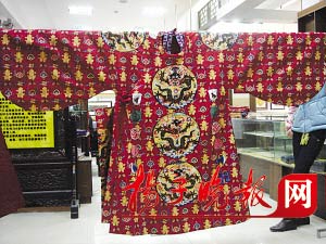 當(dāng)工作人員小心地展開“紅緙絲十二章福壽如意袞服”時(shí),記者被眼前的景象驚呆了:滿眼都是富麗堂皇、珠光寶氣,因?yàn)榭椩鞎r(shí)大面積夾進(jìn)了8168米真金線,而且使用了由孔雀羽毛捻成的400米翠羽線,無(wú)論從哪個(gè)角度看,都金光耀眼,價(jià)值十分昂貴。此件文物出土于萬(wàn)歷帝棺內(nèi)西部北側(cè),復(fù)制工作歷時(shí)2年,織造時(shí)分為13片。
