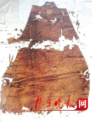 照片中,一堆已經(jīng)損壞的咖啡色織物,殘缺不全、圖案斷續(xù)、毫無(wú)光澤,就好像枯萎的花朵一般。如果不是專家介紹,沒有人會(huì)將它們和明代皇帝、云錦聯(lián)系在一起。這件“中單”出土于萬(wàn)歷帝棺內(nèi)中部中間,剛剛出土?xí)r,是金光閃閃的,但是在與空氣接觸后,迅速氧化、褪色。通過(guò)云錦研究所的復(fù)制,記者見識(shí)了“紅八寶四合云紋綢交領(lǐng)中單”當(dāng)年的風(fēng)采,“中單”無(wú)袖,里與面之間夾了一層薄棉絮,凸于表面的紋樣是象征“物華天寶”的八寶紋。據(jù)介紹,此件“中單”類似于現(xiàn)代的襯衫,“小衣之外、大衣之中”,尺寸一般小于袞服、龍袍一寸,長(zhǎng)四尺。