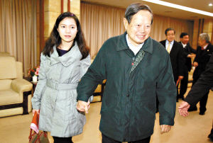 楊振寧攜翁帆的出現(xiàn)無疑是昨天最大的焦點(diǎn)。記者看到,無論走到哪里,這對老夫少妻都顯得恩愛有加,全程十指緊扣,不時(shí)溫柔地用眼神對望。楊振寧還把莎士比亞的“人生七幕戲”作了修改:“莎士比亞說人生最后一幕是沒有牙齒,沒有眼睛,沒有味覺,幾乎什么也沒有,但是我有牙齒,眼睛也看得很清楚,胃口很好,我?guī)缀跛械亩加!闭f完后他便深情地望著翁帆。