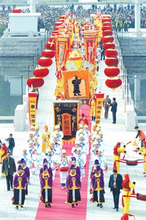 陜西省清明公祭軒轅黃帝典禮籌備工作委員會近日發(fā)出公告,向全球首次征集戊子(2008)年清明公祭軒轅黃帝祭文,并公開表示,今年的戊子年清明公祭軒轅黃帝典禮將于4月4日上午9:50在黃陵縣橋山軒轅殿廣場隆重舉行。公祭典禮舉行當天,軒轅廟前將以彩旗、龍旗裝扮,軒轅橋至軒轅殿通鋪地毯。軒轅橋欄將安置34個大紅燈籠,登陵神道,主要街道,軒轅大道,橋山廣場等地方將用空飄彩球,龍旗,宮燈,花燈等進行裝扮烘托,營造隆重氣氛。