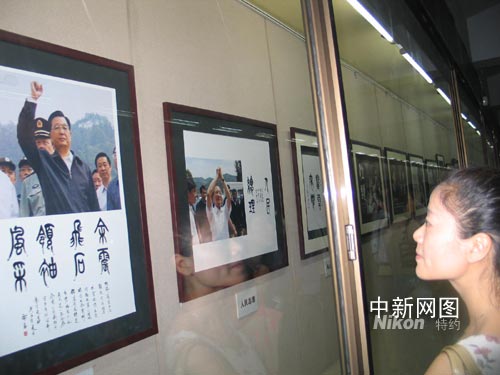 記者今天在開幕式現(xiàn)場看到,作品主要為篆書,每幅配以背景圖片,災(zāi)區(qū)人民的苦難、人民總理奔走廢墟之中的身影、殘垣斷壁間不懈抗?fàn)幍纳、救援官兵不拋棄不放棄的努力……一個個場景、一個個片段、一個個故事,充滿了震撼人心的力量。