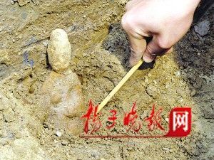 近期,在南京六朝古墓挖掘中,很少有文物出現(xiàn),基本上是“十墓九空”。在昨天下午的挖掘中,考古人員有比較大的信心。果然在挖到地磚甬道一側(cè)時(shí),隨著考古人員手中小鏟刀輕輕一撥,一個(gè)陶俑人頭露出土面。接著是完整的身子,“頭上戴著官帽,是一尊男性陶俑,高大約20多厘米!痹谶@尊陶俑的旁邊,還睡著一尊陶俑,兩手抱在胸前,但頭已不知去向,身旁還有幾枚銅錢,考古人員將于今天對(duì)陶俑繼續(xù)清理挖掘。一位考古人員一邊清理,一邊介紹,“商周時(shí)期習(xí)慣用活人殉葬,春秋戰(zhàn)國逐漸用模擬活人的俑來代替,其中用陶泥制作,經(jīng)火燒成的人物形象即為陶俑。陶俑有文武官吏、樂隊(duì)儀仗、男仆女侍等。在墳?zāi)怪信阍崴勒叩奶召|(zhì)人形,是為了炫耀墓主人生前的身份、財(cái)富、精神信仰!彼f,應(yīng)當(dāng)在墓門前甬道兩側(cè)各放一尊陶俑,另一尊可能被破壞了。