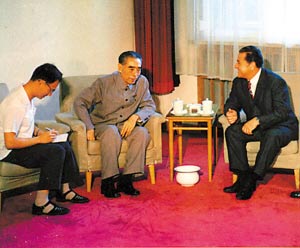 記得周總理自從病重以后,會(huì)見外賓時(shí)總是讓客人坐松軟的沙發(fā),自己坐高沙發(fā)椅子?墒沁@次,周總理坐的是和外賓一樣的單人沙發(fā)。當(dāng)周總理走到沙發(fā)邊時(shí),首先舉手請(qǐng)維爾德茨落座,然后自己緩慢地坐了下來。坐時(shí)把右手拳指頂在沙發(fā)座上,左胳膊肘撐在沙發(fā)扶手上,好像在支撐和減輕著微微前傾的身體重量。雖然身體已很衰弱,但周總理面容慈祥和藹,聲音還是那樣剛勁有力,目