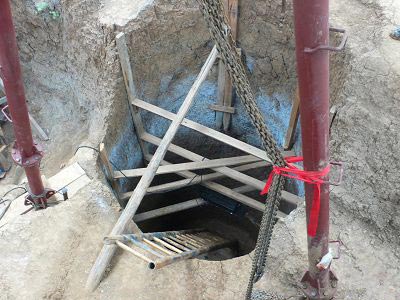 昨天下午,早報記者來到考古現(xiàn)場,看到一個小型起吊機已深入“井內”。據(jù)介紹,圓形的地宮如同一口深井,直徑2.2米,在圓井的正中間,還發(fā)現(xiàn)四塊石板拼起的方框,未見滲水,放有一層銅錢。華國榮表示,結構和內容正在逐步認識過程中。
