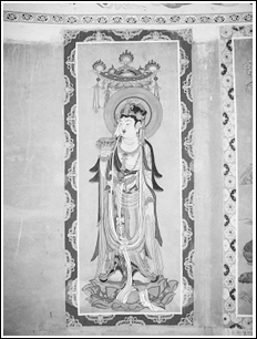 常嘉煌介紹,被盜的《藥師菩薩像》圖源自1907年法國人伯希和盜走的敦煌藏經(jīng)洞唐代絹畫,由李承仙先生復(fù)原放大繪制,壁畫高210厘米,寬80厘米。這是敦煌現(xiàn)代石窟的第一幅壁畫,也是李承仙生前留給敦煌的最后遺作。這幅壁畫是在裱糊在洞窟墻壁上的絲絹上完成的,被盜時(shí)被整體揭下。