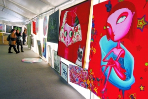 4000平方米的臨建大棚里,1700多幅當(dāng)代藝術(shù)品一個(gè)挨一個(gè)掛著。門(mén)口,一塊從字體到用色都不那么陽(yáng)春白雪的牌子上寫(xiě)著“宋莊藝術(shù)集市”!敖衲90%作品的標(biāo)價(jià)只相當(dāng)于去年的一半!奔胸(fù)責(zé)人王經(jīng)理說(shuō)。