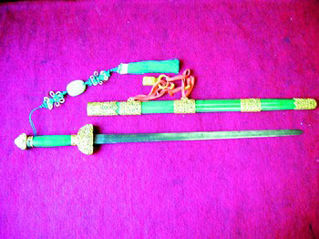 寶劍經(jīng)收藏者請名家配上劍鞘后,更顯尊貴。許馨藝攝