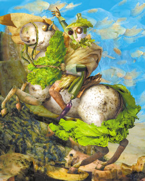 桔多淇在產(chǎn)生蔬菜作畫(huà)的想法后,就開(kāi)始轉(zhuǎn)悠北京的菜市場(chǎng)。她去買(mǎi)菜,看到長(zhǎng)相怪異的生姜,眼里就會(huì)大放異光,迅速下手,而走到賣(mài)豆腐的面前,也不說(shuō)話,拿出相機(jī)就對(duì)著白花花的豆腐開(kāi)拍。桔多淇說(shuō):“菜販以為是媒體搞衛(wèi)生監(jiān)督,嚇得不行,其實(shí)只是因?yàn)槲易觥蹲詈蟮耐聿汀返淖雷有枰艽笠粔K豆腐,我買(mǎi)回家也吃不完,于是就在菜市場(chǎng)拍了回家用電腦處理合成!苯鄱噤空f(shuō),她尋找原料的菜市場(chǎng)幾乎每一個(gè)菜攤她都“光顧”過(guò),并且對(duì)菜市場(chǎng)邊角余料情有獨(dú)鐘,甚至還會(huì)四處“撿”菜。