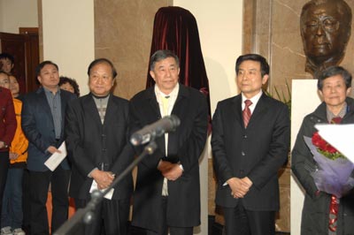 北京市委常委、宣傳部長、副市長蔡赴朝,老舍先生的子女舒乙先生、舒濟(jì)女士和舒雨女士,以及參加國際老舍研討會的一百八十余位專家學(xué)者,北京人藝全體院領(lǐng)導(dǎo)和各部門代表,當(dāng)年《龍須溝》首演陣容的演員代表鄭榕、李濱、舞美設(shè)計宋垠、韓西宇等,于是之先生的夫人李曼宜女士,新版《龍須溝》劇組代表顧威導(dǎo)演,老舍頭像作者、中央美術(shù)學(xué)院教授、雕塑藝術(shù)家孫家缽等出席了揭幕儀式。當(dāng)晚7時許,蔡赴朝和舒乙一起,共同為老舍先生雕塑揭幕。至此,中國近代文學(xué)史上的三位大師——老舍、焦菊隱、曹禺的銅像共同屹立、“聚首”在首都劇場大廳內(nèi),供后輩瞻仰!