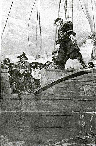 然而現(xiàn)實與藝術(shù)表現(xiàn)有著巨大的差距,歷史學(xué)家在查閱了浩瀚的史料后得出結(jié)論,這種電影里常見的海盜刑罰似乎并沒有在加勒比海時代出現(xiàn)過,唯一一次“走木板”的官方記錄出現(xiàn)在一百年后的1829年,一艘200噸的荷蘭貨船在加勒比海被海盜船截獲,在將貨物搶劫一空后,海盜強迫船員們依次“走木板”蹈海。只有一位船員因交待了財寶藏匿的處所而得到海盜們的寬恕,這位船員輾轉(zhuǎn)回到歐洲后向人們講述了這次可怕的經(jīng)歷,于是,“走木板”成為后世藝術(shù)作品里海盜們的招牌行徑。